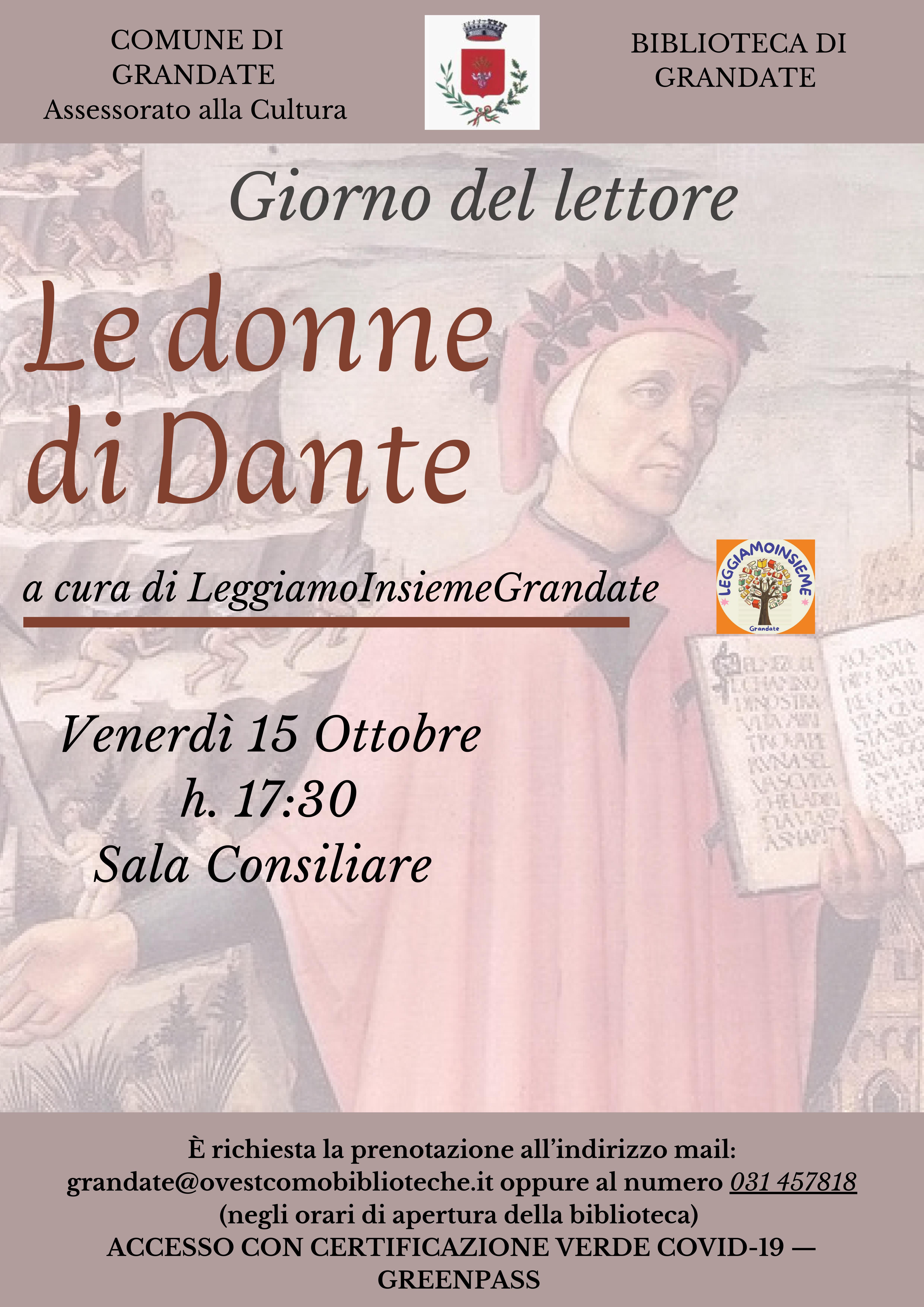 In occasione del Giorno del lettore, Venerdì 15 Ottobre alle h.17:30 si terrà la lettura "Le donnedi Dante" a cura del gruppo di lettori della Biblioteca di Grandate "LeggiamoInsieme" preso la Sala Consigliaredel Comune.