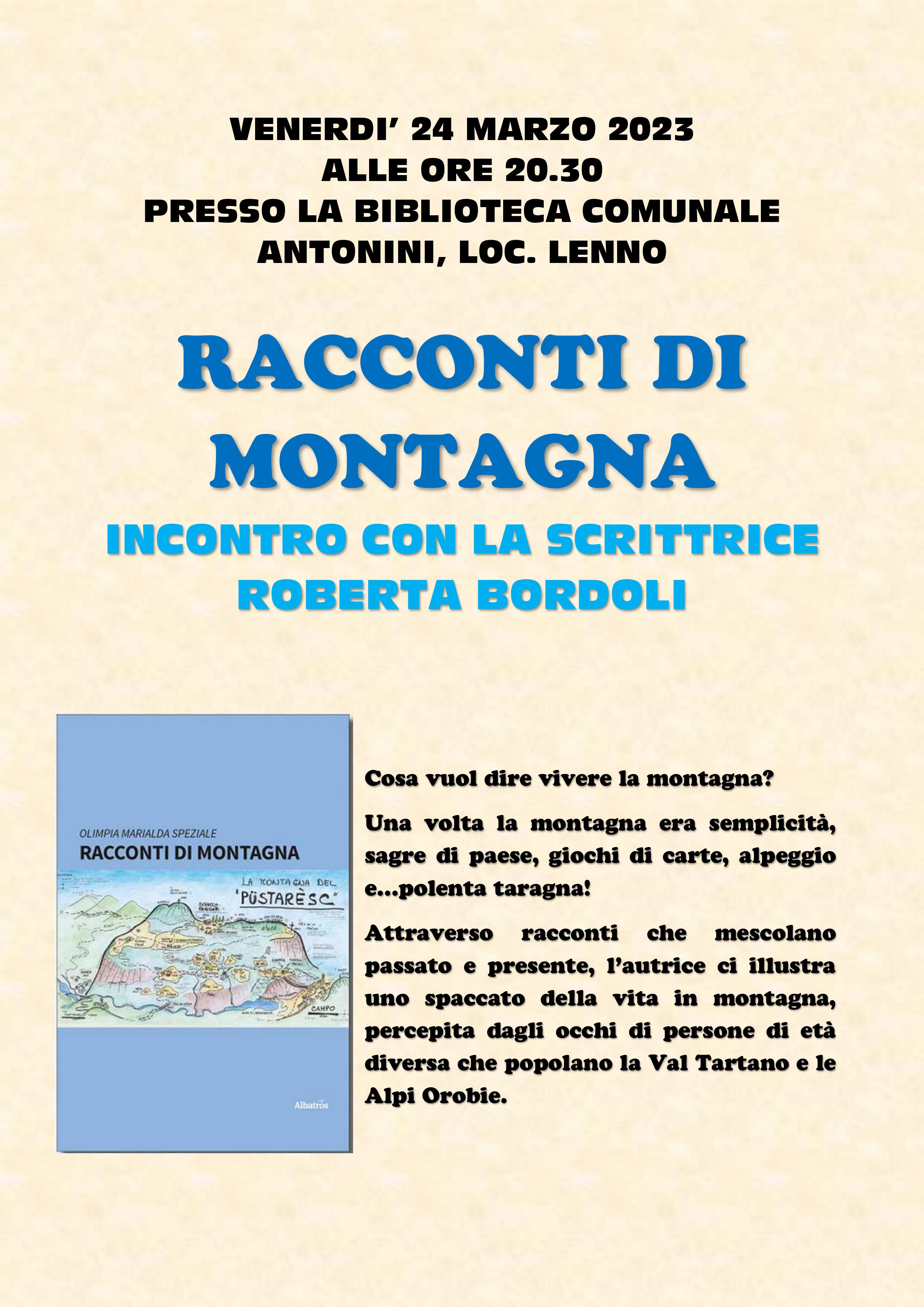 Venerdì 24 marzo 2023, alle ore 20.30, la scrittrice Roberta Bordoli presenterà il volume "Racconti di montagna".