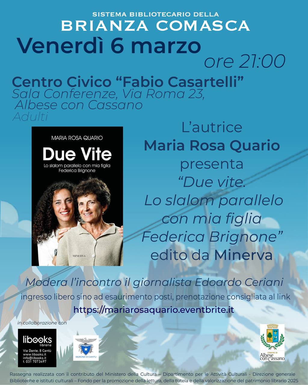 Ultimo ma non per importanza! Venerdì 6 marzo alle ore 21.00 presso la Sala Conferenze del Centro Civico F. Casartelli di Albese con Cassano, via Roma 23: Incontro con l'autrice Maria Rosa Quario e presentazione del libro "Due vite. Lo slalom parallelo con mia figlia Federica Brignone". Modera l'incontro il giornalista Edoardo Ceriani.